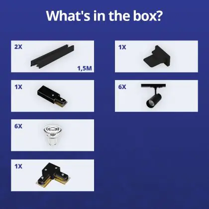 | Herstellername | Complete L shaped 1-Phase Track Set Black incl. 6x Spot fixture + GU10 2700K 3W Dim – 1,5 x 1,5 mete | |