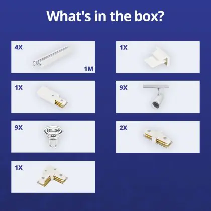 Beschreibung Komplettset 1-Phasen Rail L 2 x 2 Meter Weiß | incl. 9x Spot + GU10 2700K 3W Dimmbar + Abschlusskappe, Stromanschluss und L -Verbinder