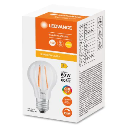 Die Ledvance Classic LED E27 Birne Fadenlampe Klar 7.2W 806lm - 927 Extra Warmweiß | Höchste Farbwiedergabe - Dimmbar - Ersatz für 60W ist eine effiziente E27 LED-Lampe mit Retrodesign und der perfekte Ersatz für Ihre konventionellen 60W Lampen mit E27. Zudem strahlt sie Licht in der Farbtemperatur 2700K - Extra Warmweiß aus und punktet durch eine lange Lebensdauer.