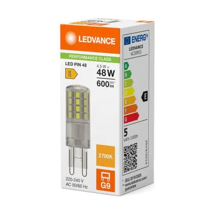 Die Ledvance LED Pin G9 Klar 4.5W 600lm - 827 Extra Warmweiß | Ersatz Für 48W ist eine effiziente G9 LED-Lampe und der perfekte Ersatz für Ihre konventionelle Halogenlampe mit W und einem G9-Sockel. Die Stifte haben einen Abstand von 9 mm. Zudem strahlt das Produkt Licht in der Farbtemperatur 2700K - Extra Warmweiß aus und punktet durch eine lange Lebensdauer.