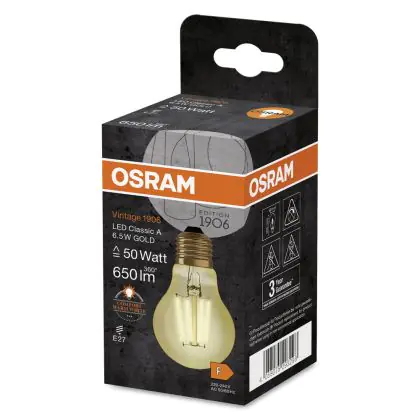 Die Osram Vintage 1906 LED E27 Birne Fadenlampe Gold 6.5W 725lm - 824 Extra Warmweiß | Ersatz für 60W ist eine effiziente E27 LED-Lampe mit Retrodesign und der perfekte Ersatz für Ihre konventionellen 50W Lampen mit E27. Zudem strahlt sie Licht in der Farbtemperatur 2400K - Extra Warmweiß aus und punktet durch eine lange Lebensdauer.