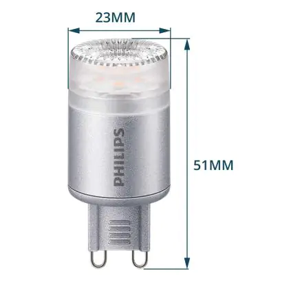Die Philips CorePro LEDcapsule MV G9 2.3W 827 ist eine moderne LED-Lampe. Sie bietet Energieeinsparungen von ca. 90 % und ersetzt herkömmliche Lampen mit einem G9-Sockel. Das macht sie zu einer beliebten Alternative. Sie spendet Licht in der Farbtemperatur extra Warmweiß, besitzt eine lange Lebensdauer und darüber hinaus eine hohe Lichtausbeute. Zudem ist die LED dimmbar.