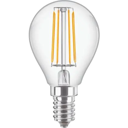 Die Philips Corepro LED Lustre E14 Kugel Fadenlampe Klar 4.3W 470lm - 827 Extra Warmweiß | Ersatz für 40W ist eine effiziente E14 LED-Lampe mit Retrodesign und der perfekte Ersatz für Ihre konventionellen 40W Lampen mit E14. Zudem strahlt sie Licht in der Farbtemperatur 2700K - Extra Warmweiß aus und punktet durch eine lange Lebensdauer.