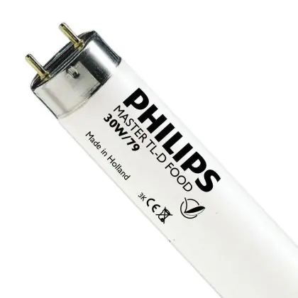 Philips TL-D Food sind Leuchtstoffröhren mit einem Durchmesser von 26mm. Diese Röhre sind besonders für die Beleuchtung von Lebensmitteln geeignet, da sie beispielsweise die Ansehnlichkeit von Fleischprodukten verbessern können. Die Philips TL-D Food 30W 79 sind 90 cm groß und haben einen G13 Lampensockel.