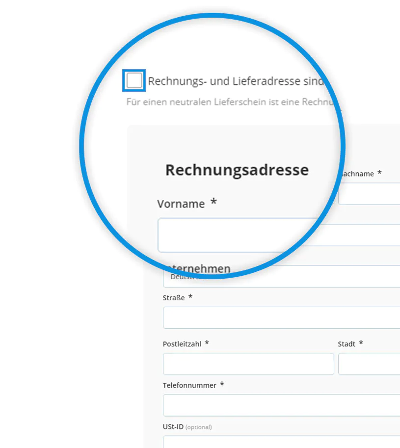 Entfernen Sie das Häkchen bei "Rechnungs- und Lieferadresse sind identisch."
